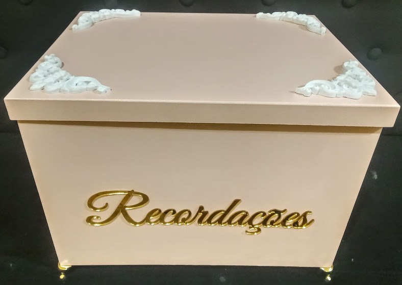 Detalhes: pezinhos dourados,palavra recordações em acrílico dourado,quatro aplique de resina nas laterais da tampa