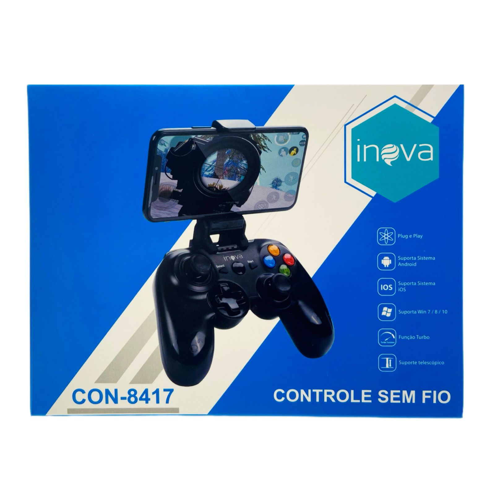 Controle sem fio para jogos. Suporta sistema Android, iOS e Windows 7/8/10. Conta com a função turbo que o torna mais forte e rápido. Possui suporte telescópico de fácil utilização em jogos. Botões L2 e R2 com sensor de efeito tornando o funcionamento mais preciso.