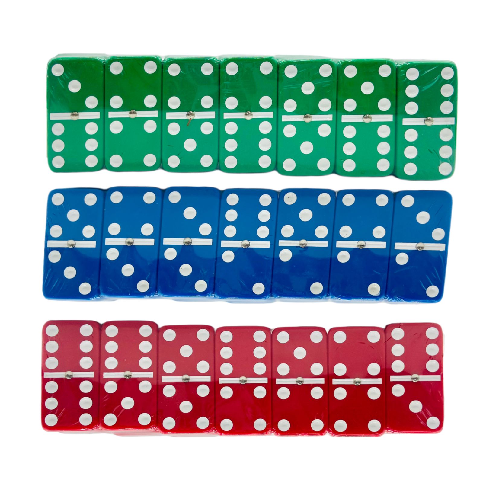 Dominó tradicional com 28 peças coloridas que podem ser vermelhas, azuis ou verdes, de acordo com a disponibilidade do estoque. Acompanha caixa em lata.