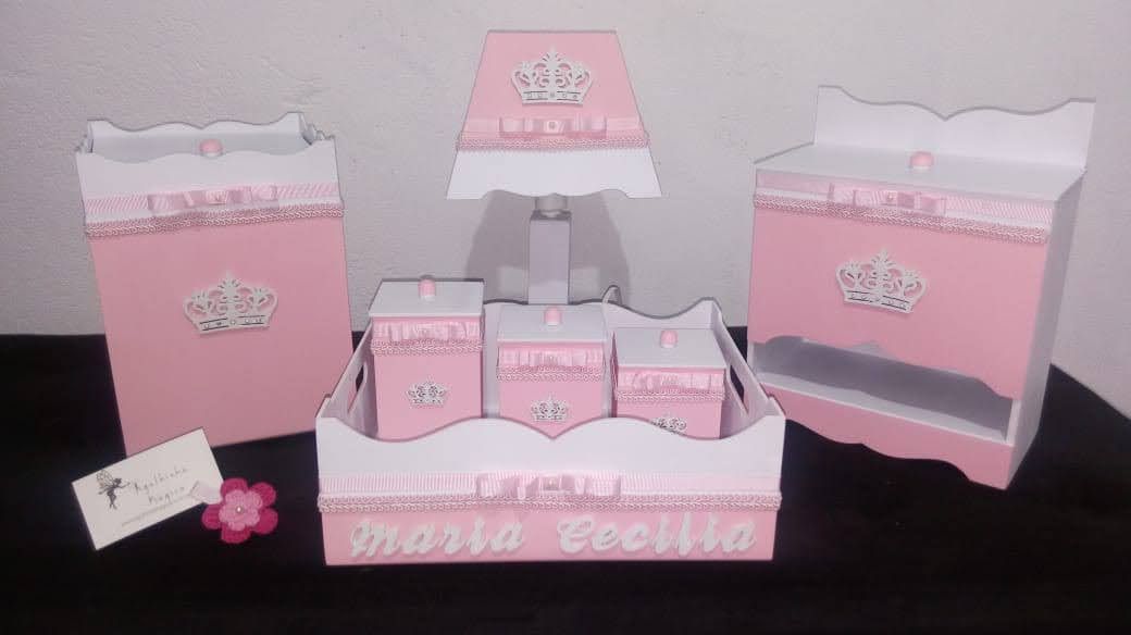kit contem 7 peças 1 pote 8x8x8 1 pote 8x8x10 1 pote 8x8x12 1 lixeira 25x25x20 1 porta fralda 22x12x28 1 abajur c/fiação 19x19x15(cupula) 1 bandeja30x25x10